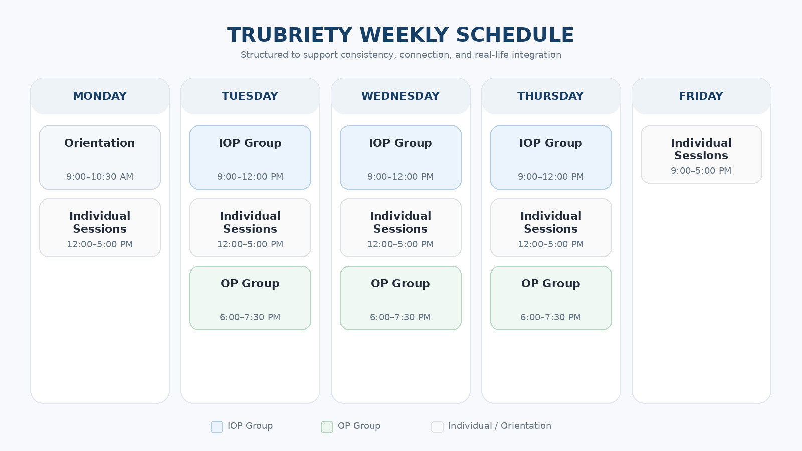 Trubriety’s Intensive Outpatient Program (IOP) provides structured, evidence-based care for individuals who need more support than weekly therapy, but do not require inpatient or residential treatment.